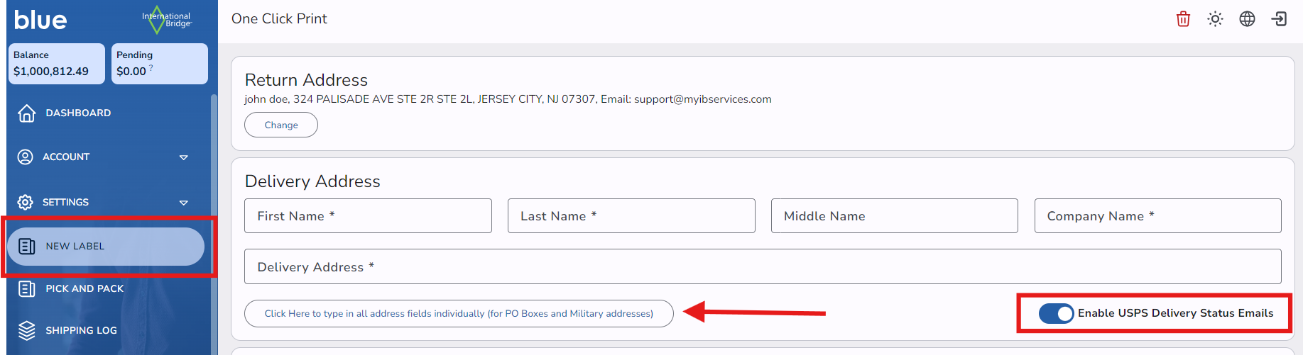 2. To choose an email for receiving tracking status updates click on the New Label button and open the Address Edit page by clicking on the link Click here to type in all address fields individually that is under Delivery Address information. This can be done on each label separately.