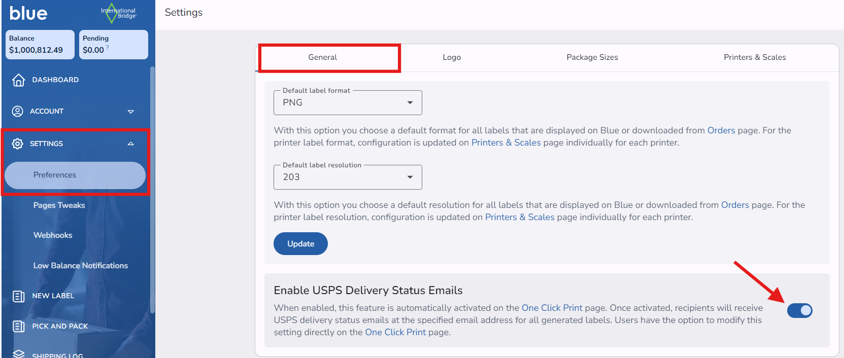 1. Go to your blue account, click on the button Settings>Preferencesfrom the left side menu. Then under tab General enable USPS Delivery Status Emails. When enabled, this feature is automatically activated on the One Click Print page. Once activated, recipients will receive USPS delivery status emails at the specified email address for all generated labels.