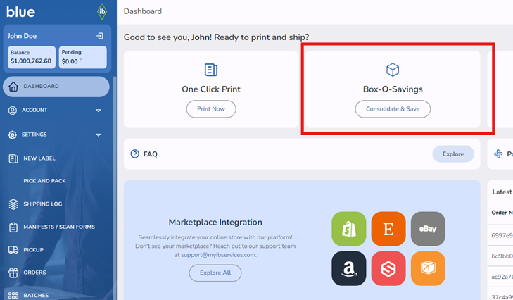 When you’re ready to consolidate shipments, the interface displays all active NonCon labels. You can select and combine them into a single outbound package through your IB blue account.
