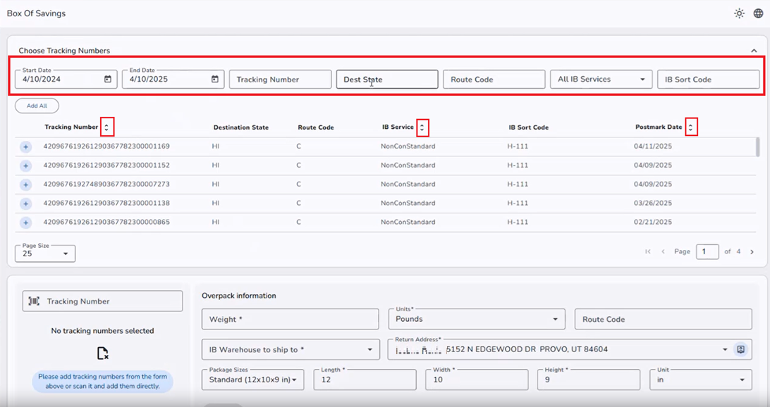 - Filter by date, tracking number, destination state, IB service, or IB sort code.