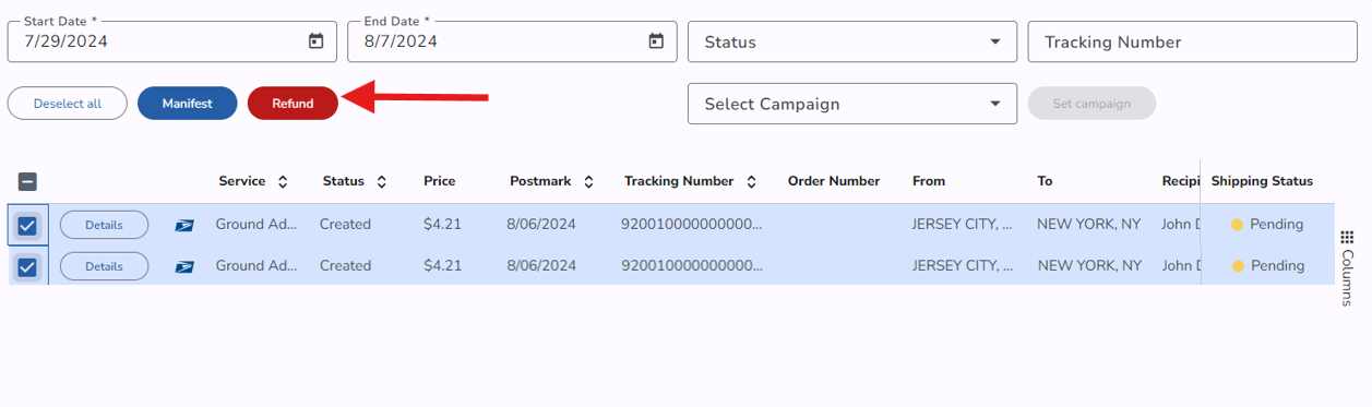 You can also request a refund for a group of labels, by selecting desired labels, and clicking Refund button in upper left corner of Shipping log page.
