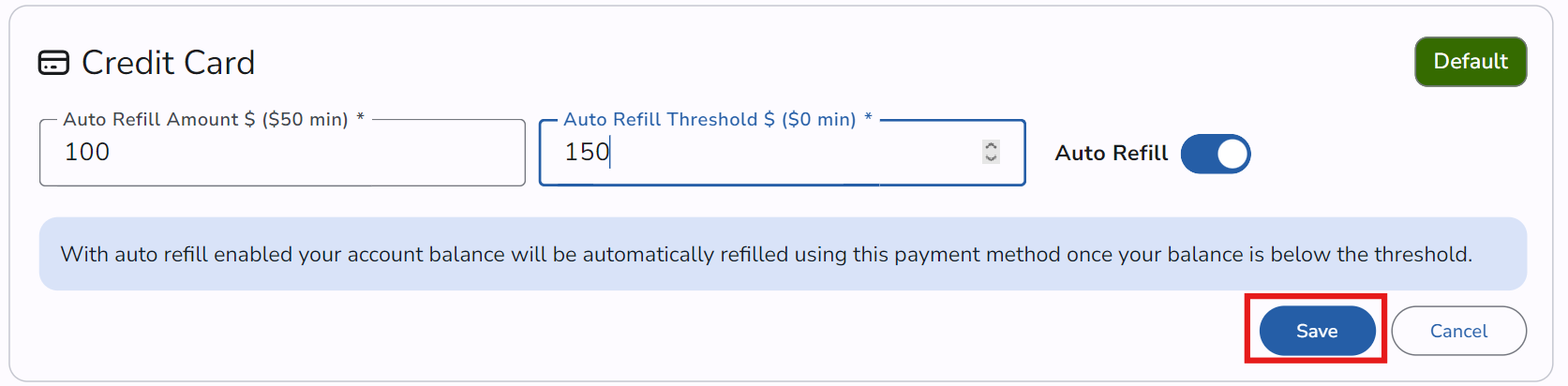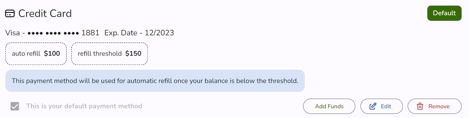 When complete, your payment method will show the updated auto refill value and the threshold, as shown below.