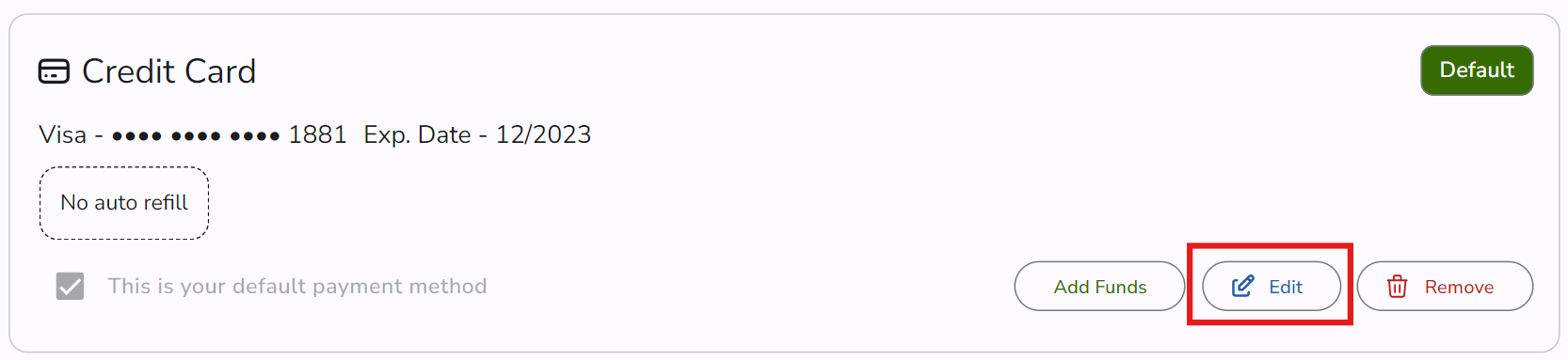 1. Go to your account My Payment Methods page, find your default payment method, and click Edit