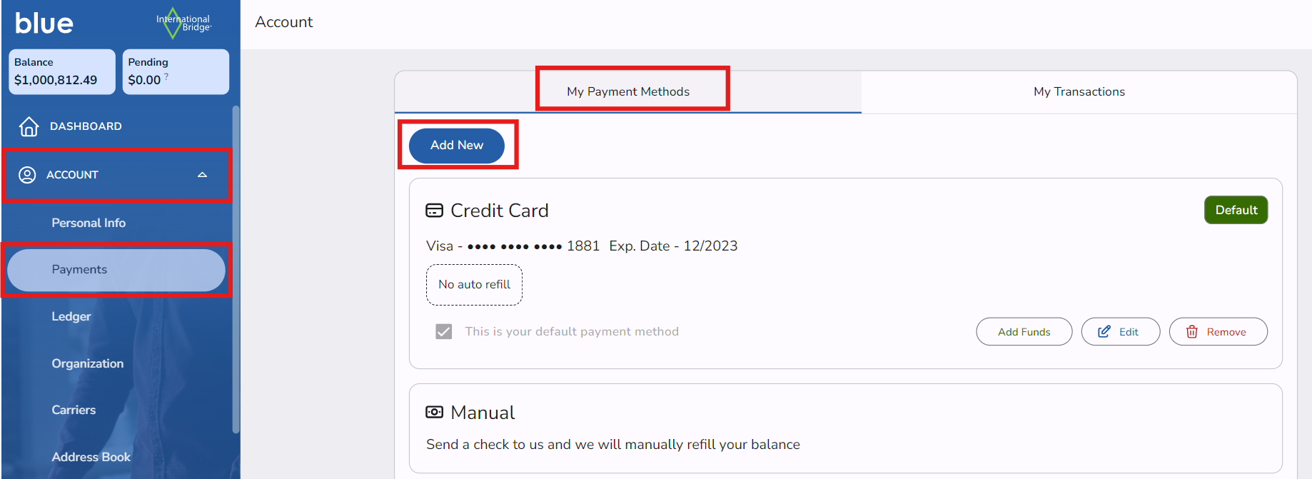 1. Log into your blue account, go to Account and then click on the Payments>My Payment Methods page.