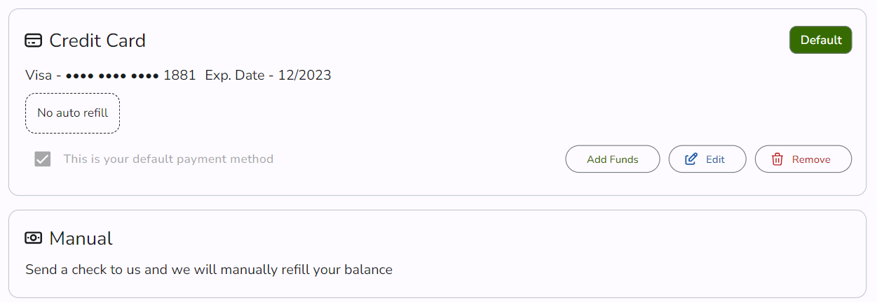 To add funds to your account balance, simply click the Add Funds button and enter the desired amount.