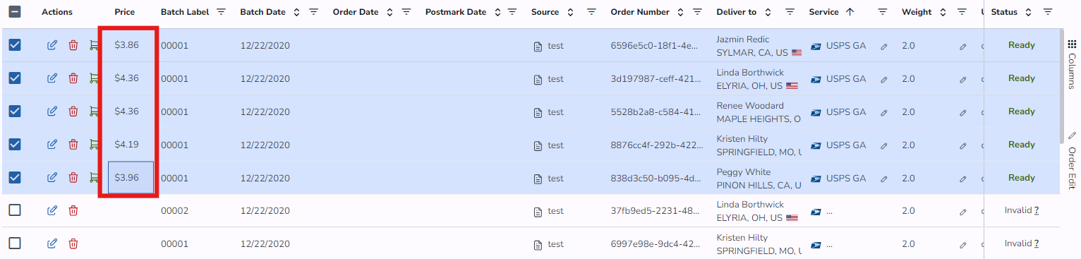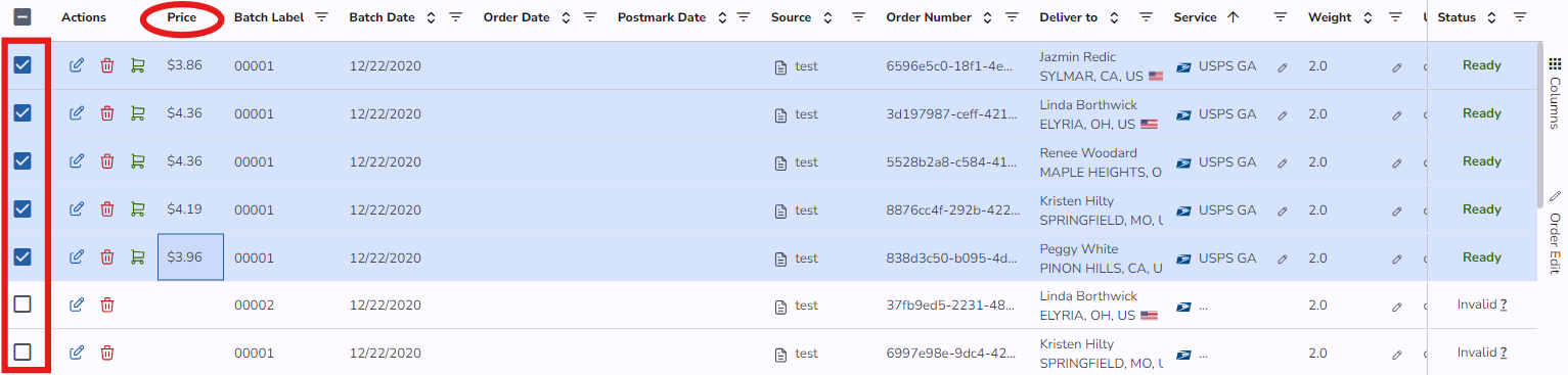 - This process does not purchase a label, but the Price column is updated and displays the current price for each order selected.