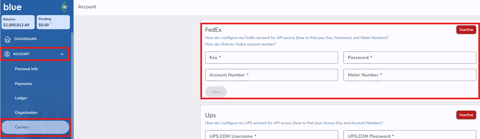 - You now have all the necessary information to configure your FedEx account in blue. Navigate to blue and log in. Navigate to Account -> Carriers and in the FedEx section fill in the following: