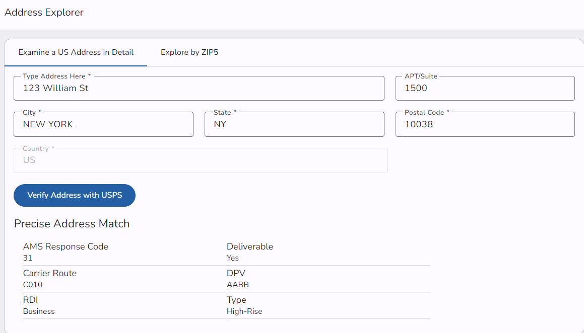 blue Address Explorer allows you to check the accuracy of the destination US address before you purchase a shipping label. It is important to confirm the destination address is valid, to avoid undeliverable and surcharges. blue provides the USPS address verification for free, we connect to the USPS address verification API to check the accuracy of the US address.
