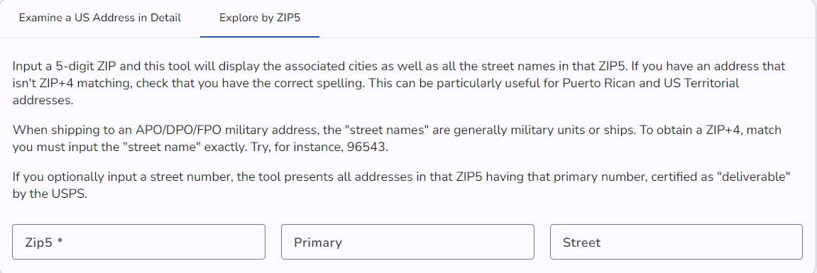Also, you may explore addresses by ZIP - Input a 5-digit ZIP and this tool will display the associated cities as well as all the street names in that ZIP5. This can be particularly useful for Puerto Rican and US Territorial addresses.